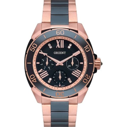 Características: com caixa em aço+cerâmica, aro rotativo unidirecional e pulseira em aço+cerâmica