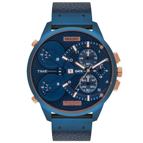 Cronógrafo Gênero: Masculino Visor: Azul Vidro: Cristal mineral Funções: Calendário Pressão: 50 M Características: com caixa Aço + IP Blue e pulseira em Couro Diâmetro da caixa: 52 mm