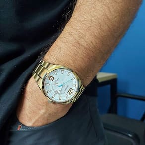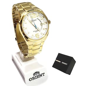Marca: Orient Modelo: MGSS1159 S2KX Tipo de relógio: Analógico Gênero: Masculino Cor da caixa: Dourado Cor da pulseira: Dourado Estilo: Casual Alarme: Não Cronômetro: Não Calendário: Sim Luz: Não – ponteiros e marcadores fluorescentes Resistência à água: Sim – 5 ATM = 50 metros Tipo de fecho: Dobrável, com trava lateral Material da Caixa: Aço Inoxidável Material da Pulseira: Aço Inoxidável Características do vidro: Cristal Mineral Tamanho da caixa: 44 mm Peso: 141 g Comprimento da pulseira: 24 cm Largura da pulseira: 22 mm Tampa do fundo: Rosqueado Alimentação: Bateria Garantia do Fabricante: 12 meses Fabricante: Orient Relógios da Amazônia LTDA