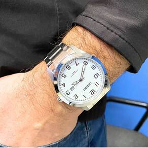 Marca: Orient Modelo: MBSS1360 B2SX Tipo de relógio: Analógico Gênero: Masculino Cor da caixa: Prateado Cor da pulseira: Prateado Estilo: Casual Alarme: Não Cronômetro: Não Calendário: Sim Luz: Não – ponteiros e marcadores fluorescentes Resistência à água: Sim – 10 ATM = 100 metros Tipo de fecho: Dobrável, com trava lateral Material da caixa: Aço Inoxidável Material da Pulseira: Aço Inoxidável Características do vidro: Cristal Mineral Tamanho da caixa: 45 mm Espessura da caixa: 10 mm Comprimento da pulseira: 24 cm Largura da pulseira: 25 mm Tampa do fundo: Rosqueado Peso: 130 Gramas Alimentação: Bateria Garantia do Fabricante: 12 meses Fabricante: Orient Relógios da Amazônia LTDA