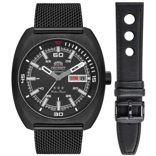 Mecanismo: automático Gênero: masculino Visor: preto Vidro: cristal mineral Funções: calendário duplo, acompanha uma pulseira em couro, quick release system que dispensa uso de ferramentas para trocas das pulseiras Prova d'água: 50m Características: com caixa em aço + ipblack e pulseira tipo mesh Diâmetro da caixa: 42 mm Marca: Não Informado