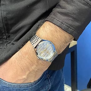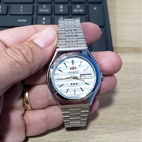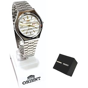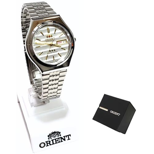 Marca: Orient Modelo: 469WB7AF B1SX Tipo de relógio: Analógico Gênero: Masculino Cor da caixa: Prateado Cor da pulseira: Prateado Estilo: Casual Alarme: Não Cronômetro: Não Calendário: Sim Luz: Não – ponteiros e marcadores fluorescentes Resistência à água: Sim – rotinas diárias Tipo de fecho: Dobrável Material da caixa: Aço Inoxidável Material da Pulseira: Aço Inoxidável Características do vidro: Cristal Mineral Tamanho da caixa: 38 mm Espessura da caixa: 12 mm Comprimento da pulseira: 23 cm Largura da pulseira: 15 mm Tampa do fundo: Rosqueado Peso: 90 Gramas Alimentação: Automático Garantia do Fabricante: 12 meses Fabricante: Orient Relógios da Amazônia LTDA