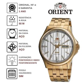 Relógio ORIENTModelo 469GP043 S1KXGenero: MasculinoTamanho: Grande  Funções  - Analógico- Calendário dia do mês e da semana Características  - Mecânico / Automático- Coroa: Simples- Tampa posterior : Rosqueada- Resistência à água : 50m- Vidro : Cristal Mineral- Mostrador : Prata com detalhes dourado- Ponteiros e cifras luminosos (Fluorescente)- Material da caixa : Aço Dourado- Material da pulseira : Aço Dourado Medidas - Diâmetro da caixa : 4,2 cm- Diâmetro do visor : 3,4 cm- Espessura da caixa : 1,2 cm