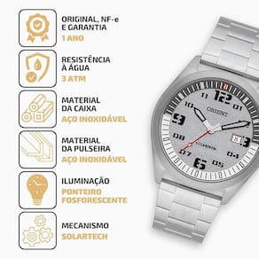 Ficha Técnica: Formato da caixa: Redondo Gênero: Masculino Cor: Prata Cor do mostrador: Cinza Material da Pulseira: Aço inoxidável Material da Caixa: Aço inoxidável Mostrador: Analógico Mecanismo: Solartech Nivel de Resistência à Agua: 3 ATM 30 metros Material do Vidro: Cristal Mineral Tipo de Fecho: Fecho Dobrável com botão Tipo de Coroa: Simples Fundo: Rosqueado