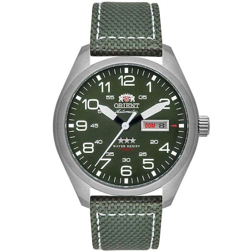 Relógio orient masculino ref: f49sn020 e2ep automático militar prateado Descrição do produto: Linha: orient automatic três estrelas Vidro: cristal mineral Funções: automático, analógico, calendário duplo com opção em português Resistência à água: 100 m Características: com caixa aço inoxidável escovado e pulseira couro legítimo revestido de nylon verde Diâmetro da caixa: 4,3 cm Alimentação do maquinário: mecânico automático Mostrador verde militar com números Estilo: militar Garantia de 1 ano