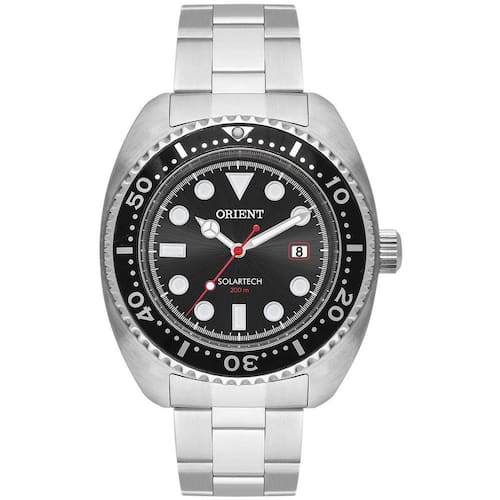 Vidro: cristal mineral Funções: calendario, analógico, solar Resistencia à água: 200 m Características: com caixa aço inoxidável e pulseira aço inoxidável Diâmetro da caixa: 4,4 cm Alimentação do maquinário: energia solar Mostrador preto Fundo rosqueado Linha: orient solartech Aro giratório preto Coroa com trava rosqueável