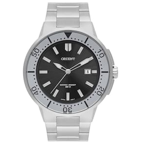 Vidro: cristal mineral Funções: calendario, analógico Resistencia à água: 50 m Características: com caixa aço inoxidável e pulseira aço inoxidável Diâmetro da caixa: 4,6 cm Alimentação do maquinário: bateria Mostrador preto Fundo rosqueado Linha: orient neosport