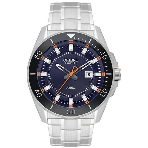 Vidro: cristal mineral Funções: calendario, analógico, solar Resistencia à água: 100 m Características: com caixa aço inoxidável e pulseira aço inoxidável Diâmetro da caixa: 4,5 cm Alimentação do maquinário: energia solar Mostrador azul com detalhes em laranja Aro fixo preto Fundo rosqueado Linha: orient solartech