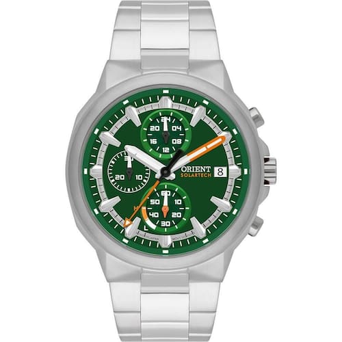 Relógio orient masculino ref: mbssc282 e1sx solar cronógrafo prateado Descrição do produto: Vidro: cristal mineral Funções: calendario, analógico, solar, cronógrafo Resistencia à água: 50 m Características: com caixa aço inoxidável e pulseira aço inoxidável Diâmetro da caixa: 4,3 cm Alimentação do maquinário: energia solar Mostrador verde com detalhes em laranja Fundo rosqueado Linha: orient solartech de 1 ano Marca: Não Informado