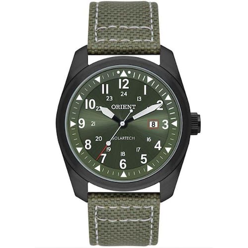 Referência ORIENT do Brasil MPSN1004 E2EBMáquina com movida a energia solar, Reserva de energia: 4 meses, Precisão: ±15 segundos por mêsMecanismo Analógico com 3 ponteirosCaixa do relógio em aço inoxidável pretoPulseira de tecido verde na parte externa e na parte interna de couro pretoFivela de aço inoxMostrador verdeVidro de Cristal MineralRelógio com calendário dia do mêsCoroa simples de pressão padrão sem roscaTampa posterior rosqueadaResistência à água 10ATM (100M)
