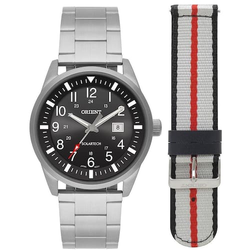 Cor do aro: prata Cor da caixa: prata Cor do mostrador: preto Calendario: sim Mecanismo: analógico Vidro: cristal mineral Máquina: solar tech orient movido a luz solar ou luz ambiente