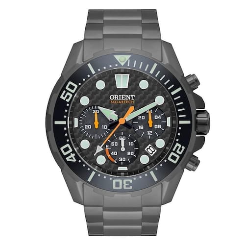 Funções: Analógico / Calendário / Cronógrafo / Autônomia solar de até 4 meses / Mostrador degradê / Indexes e números em relevo / Aro rotativo / valvula de gás hélio