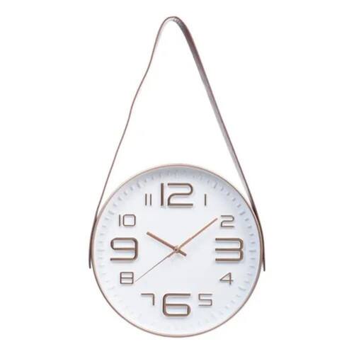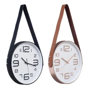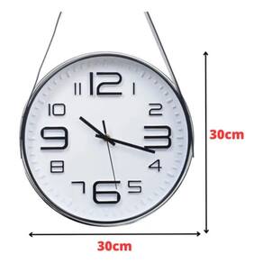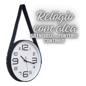 - Material relógio: Plástico - Material da Corda: Alça de couro sintético - Silencioso, ponteiro continuo; - Medida relógio: 30 cm x 30 cm x 4,1 cm; - Altura entre Relógio e Alça: 25 cm - Utiliza 1 pilha AA (Não inclusa);