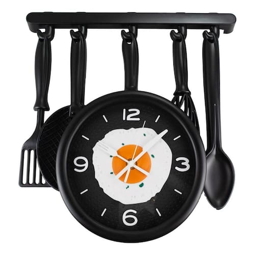 Relógio de parede na cor preta com enfeite em forma de utensílios de cozinha e fundo enfeitado com imagem de um ovo. Relógio com 34 x 33 cm de dimensão. Ponteiros para horas, minutos e segundos. Numeração arábica. Estilo criativo. Material: plástico; Funcionamento: 1 pilha AA
