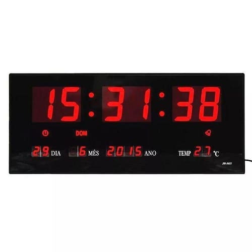 Características sobre o produto: Relógio digital termômetro calendário com led. Tamanho grande led vermelho. Visualização a distância. Exibição, minutos, ano, mês, data, temperatura hora. Quatro botões na parte traseira para definir a hora e data. Ele também tem um despertador. Memória embutida para uma falha de energia para manter os dados. Construção de plástico. Adaptador de operação 110 220v ac 5v 500mah Apropriado para lojas, igrejas, cafés, escritório, ideal para consultórios, academias, residências e comercio em geral. O relógio led digital de parede é ideal para quarto, sala, escritórios, empresas entre outros por ter um led de cor suave. Produto de fácil instalação, design moderno e com sistema de ajuste simples. Possui calendário automático, termômetro e alarme com música. Especificações técnicas: Alarme Relógio, modo 12 ou 24h com calendário e sensor temperatura incluso Gabinete em plastico resistente muito leve e design compacto na cor preta; Display com alta performance para visualização em ambientes internos; Cores do display: vermelho Botões laterais para controle e acesso do equipamento; Visualização: até 30m. Uso interno. Bivolt: 110 ou 220v automático Fácil visualização à distância Características: Excelente nitidez Temperatura Hora Dia, mês e ano. Alarme até 4 programações Calendário Dia da semana em português Números grandes de fácil visualização 5 x 3 cm. Fácil ajuste. Fácil instalação. Sistema eletrônico de quartz, não atrasa nem adianta. Não perde a memória quanto acaba a energia. Dimensões: Largura: 36,5 cm Altura: 15,5 cm Profundidade: 3,6 cm Preto com led vermelho Peso: 800 gr Itens na embalagem: 1 relógio de parede 1 fonte de energia ( bivolt )