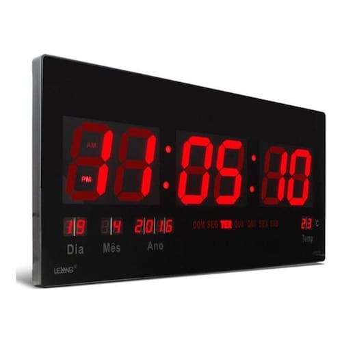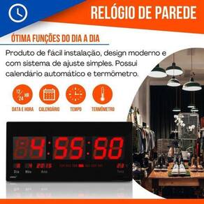 Relógio modo 12 ou 24h com calendário e sensor temperatura incluso Gabinete em plástico resistente muito leve e design compacto na cor preta Displays com alta performance para visualização em ambientes internos Cores do display: vermelho Botões traseiro para controle e acesso do equipamento Visualização: até 30m. Uso interno. Bivolt: 110 ou 220v automático Fácil visualização à distância