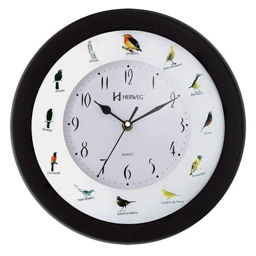 Relógio de Parede novo com canto de pássaros brasileiros. - Máquina Quartz Sweep sem tic-tac, - Vidro mineral em formato côncavo, - Desligamento noturno automático dos cantos dos pássaros, não canta das 22:00 às 05:00, - Usa 3 Pilhas Comum tamanho AA 1,5 Volts, - Simplesmente Maravilhoso. - Ideal para quem gosta de ouvir cantos de pássaros, - Medidas: 30x30x4,2 cm João de Barro, Bem-te-vi, Curió, Pintassilgo, Canário da Terra, Sabiá Laranjeira, Fogo Apagou, Corrupião, Grauna, Azulão, Urutau, Uirapuru,