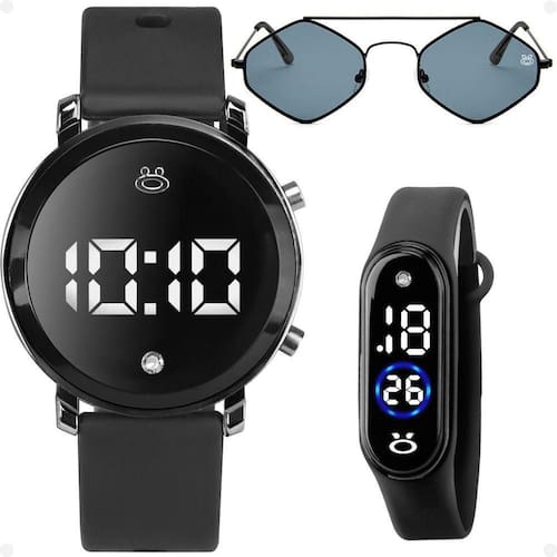 Relogio Preto Led Feminino + Oculos Sol + Bracelete Digital Presente Inoxidável Losango Proteção Uv Kit de Acessórios Femininos Orizom Modelo Maria Descrição Completa: Este exclusivo kit de acessórios da marca Orizom é perfeito para mulheres que buscam estilo, sofisticação e funcionalidade. Com itens selecionados e fabricados com materiais de alta qualidade, o kit inclui: