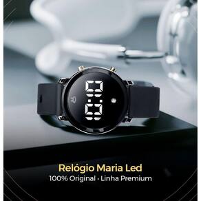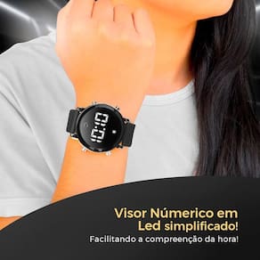 ### 2. Relógio Digital Feminino - Formato Bracelete - Design moderno e minimalista, totalmente em preto. - Detalhe de pedrinha de strass transparente no visor, complementando o estilo. - Pulseira em silicone ajustável, ideal para qualquer tamanho de pulso. - Ótimo para um visual casual e prático para o dia a dia. TENHA ESTILO E PRATICIDADE COM ESTE RELÓGIO MODERNO!