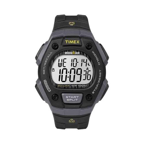 ESPECIFICAÇÕES TÉCNICAS - Marca: Timex - Gênero: Masculino - Tipo de mostrador: Digital - Funções: O Ironman Tradicional de 30 voltas apresenta uma luz noturna Indiglo de cor laranja; Exibição do refletor branco durante todo dia; Recuperação de memória de 30 voltas; Empurrador superior para uma volta-divisão fácil; Contador de 99 voltas; Configuração para frente-para trás; Lembretes de configuração integrados; Conjunto de modo personalizável; Modo de ocasiões predefinidas e 3 alarmes: diário, dia da semana, sim de semana, semanal; 3 fusos horários; Temporizador de contagem regressiva de 24 horas com contagem regressiva-parada CS e contagem regressiva-repetição CR ; Cronógrafo de 100 horas com opção de volta ou divisão em dígitos grandes. - Tipo de fecho: Fivela - Cor da caixa: Preto - Cor do mostrador: Cinza - Cor da pulseira: Preto - Largura da caixa: 3,8 cm - Resistência à água: 10 ATM 100 m - Garantia: 12 meses