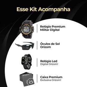 Relogio Prova Dagua Preto + Oculos Sol Protecao Uv + Caixa Kit Exclusivo: Relógio Masculino Orizom Spaceman - Preto e Dourado, Relógio Digital Masculino - Preto e à Prova d\'Água, Óculos de Sol Esportivo - Proteção UV, Qualidade Premium e Caixa Premium Orizom Spaceman. Surpreenda com nosso Kit Exclusivo, que inclui o Relógio Masculino Orizom Spaceman - Preto e Dourado, com design digital e à prova d\'água, pulseira em silicone reforçado e recursos completos como alarme, luz de LED e cronômetro. Acompanha também um Relógio Digital Masculino - Preto e à Prova d\'Água, com design moderno e resistência à água, além de uma caixa premium Orizom Spaceman, desenhada especialmente para acomodar os relógios com elegância.