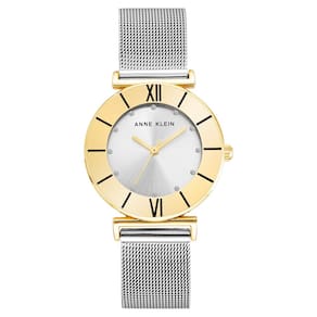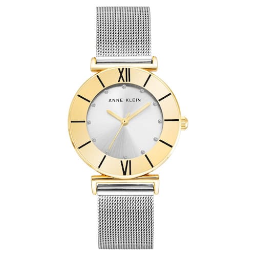 Relógio feminino Anne Klein com pulseira de malha com detalhes em glitter — Lente de cristal mineral — Mostrador prateado com ponteiros dourados e marcadores com detalhes em glitter — Pulseira de malha prateada com fivela deslizante ajustável — Não resistente à água