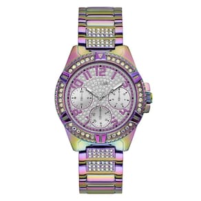 Relógio multifuncional GUESS com pulseira de cristal roxo, roxo/prateado - Estojo: redondo roxo polido + cristais - Pulseira: pulseira de aço de malha roxa polida com fecho de fivela piloto - Comprimento da alça: 184 mm - Características do mostrador: exibição de dia, data e hora internacional de 24 horas - Cor do mostrador: detalhes em cristal com marcadores roxos