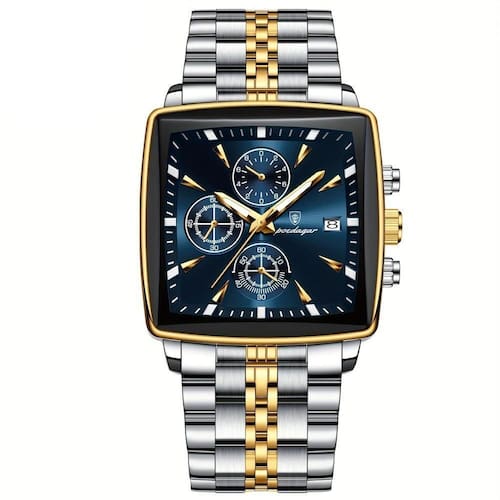 Relógio Quadrado Em Aço Inoxidável Para Homens Com Cronógrafo À Prova Da Água Azul Dourado