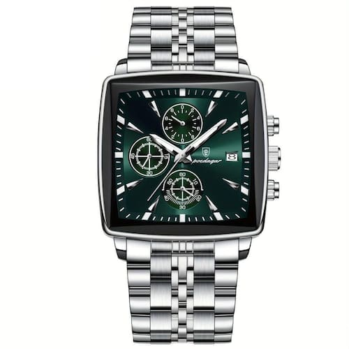 Relógio Quadrado Em Aço Inoxidável Para Homens Com Cronógrafo À Prova Da Água Verde Prata