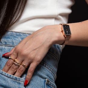 O Relógio Feminino New Port Quadrado Vermont, com sua pulseira de aço inoxidável rosé, apresenta dimensões de 20x26mm. A caixa é fabricada em metal rosé, contrastando elegantemente com o mostrador preto, protegida por um vidro de mineral resistente.