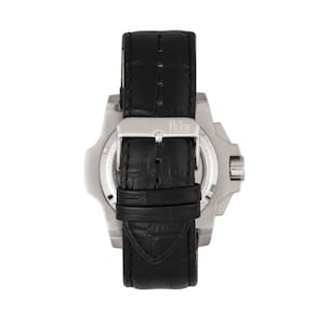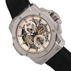 Mostrador prateado (esqueleto central) aprimorado por ponteiros luminosos prateados. Caixa de aço inoxidável prateado com pulseira de couro preto. Movimento automático. Resistência à água até 50 metros. Bisel fixo. Cristal mineral resistente a arranhões. Parte traseira transparente. Fecho de pino. Tamanho da caixa: 48 mm x 13 mm. Pulseira de 24 mm x de comprimento. Relógio Commodus Reign REIRN4001.