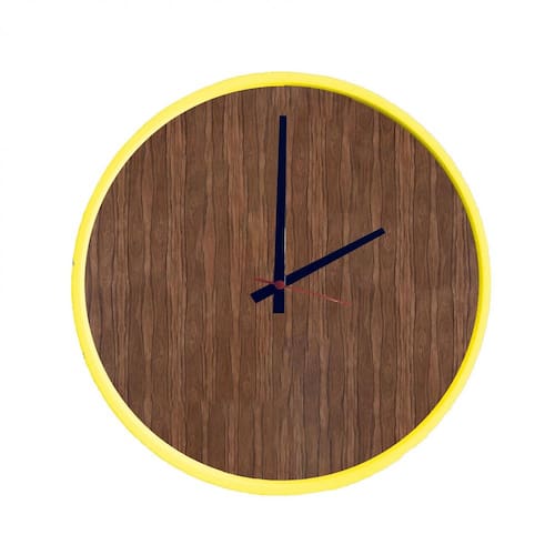 Relógio Round Amarelo Mostrador Pau Ferro Ponteiro Preto 50 cm Moldura em Alumínio que proporciona leveza ao produto, e permite acabamento em pintura epóxi-pó não enferruja .