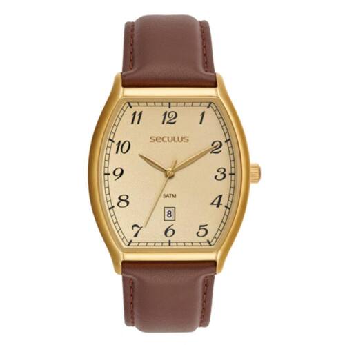 Relógio seculus 23746gpsvdc2 retangular dourado O relógio seculus 23746gpsvdc2 combina sofisticação e estilo clássico em um acessório versátil para o dia a dia. Sua caixa em aço inoxidável no formato retangular traz um design elegante e moderno, enquanto o mostrador dourado com algarismos preto garante excelente legibilidade. Equipado com calendário na posição das 6 horas e resistência à água de até 5 atm, é ideal para acompanhar a rotina com praticidade e bom gosto. A pulseira em couro marrom completa o visual refinado e confortável deste modelo atemporal. Especificações técnicas Mecanismo: analógico movimento miyota Gênero: masculino Visor: dourado Vidro: cristal mineral Funções: calendário Prova d'água: 50m Características: com caixa em aço inoxidável e pulseira em couro marrom Diâmetro da caixa: 38 mm : 2 anos pelo fabricante seculus Marca: Não Informado