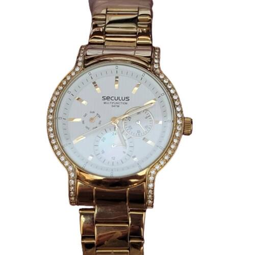Relógio Seculus 28268LPSGDS2 dourado, com design elegante e prático. Perfeito para o dia a dia. Material da caixa: Metal; Material da pulseira: Metal; Fechamento: Fivela de implantação; Funções: Calendário de dias e cronógrafo com três mini-mostradores, de minutos, segundos e cronômetro; Mostrador: Com algarismos numéricos e ponteiros de horas, minutos e segundos; Fundo: Rosqueado; Medidas da caixa: 4cm de altura e 4cm de largura; Medidas da pulseira: 18cm de comprimento e 2cm de largura; Resistência à água: 50m; : 2 anos, pelo fabricante. Marca: Não Informado