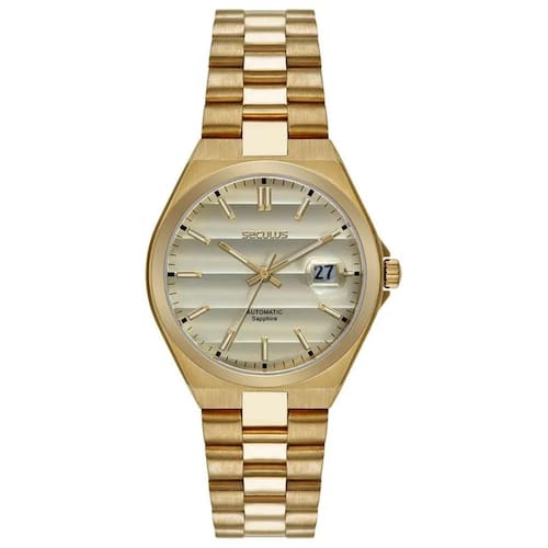 Relógio seculus automático 77313gpsvda3 Relógio automático com 21 joias e reserva de carga de 42h, construido todo em aço inoxidável, traz elegância e funcionalidade em um só acessório. Equipado com função calendário com luneta, oferece praticidade para o dia a dia. O fundo em vidro permite uma visualização do movimento interno, destacando a engenharia de precisão. O mostrador verde com efeito adiciona um toque contemporâneo ao design, complementado por uma caixa mediana de 40mm de diâmetro. A pulseira sólida com fecho borboleta garante conforto e um ajuste perfeito para todos os tamanhos de pulso. Este relógio é uma escolha indispensável para quem valoriza estilo e performance em um único acessório. Especificações técnicas Mecanismo: automático movimento miyota cal. 8215 - 21 joias reserva de carga de 42h Gênero: masculino Visor: dourado Vidro: safira Funções: calendário com lupa Prova d'água: 50m Características: com caixa e pulseira em aço inoxidável, fecho borboleta e case back transparente. Diâmetro da caixa: 40 mm : 2 anos pela fabricante seculus