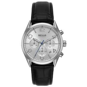 Mecanismo: Quartzo Gênero: Masculino Visor: Prata Vidro: cristal mineral Funções: calendário e cronógrafo Prova d'água: 100m Características: com caixa em aço e pulseira em couro Diâmetro da caixa: 40 mm : 2 anos pelo fabricante Seculus