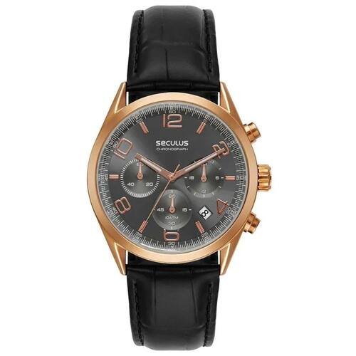 Relógio seculus cronógrafo 77308gpsvrc3 vidro abaulado couro rosé Este relógio cronógrafo rosé combina elegância e funcionalidade em um só acessório, com uma caixa robusta de aço inoxidável de 40mm de diâmetro e acabamento dourado. O vidro abaulado protege o mostrador em camadas e cria um efeito visual exclusivo. Também conta com ponteiros luminosos, proporcionando melhor visibilidade em ambientes com pouca luz. A pulseira de couro com tons avermelhados e textura croco, tem um design que foi projetado para se ajustar perfeitamente a todos os tamanhos de pulso, tornando este cronógrafo uma escolha ideal para quem busca unir sofisticação e alto desempenho. Especificações técnicas Mecanismo: quartzo Gênero: masculino Visor: preto Vidro: cristal mineral Funções: calendário e cronográfo Prova d'água: 100m Características: com caixa em aço e pulseira em couro preto Diâmetro da caixa: 40 mm : 2 anos pelo fabricante seculus