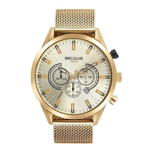 Garantia do Fabricante 2 anos Marca Seculus Referência 44134GPSVDA2 Cor Dourado Pulseira Aço Mica Material Cristal Mineral Mecanismo Analógico Tipo de Fecho Fecho de pressão Funcionamento Bateria Tampa Posterior Rosca Alarme Não Calendário Sim Cronômetro Sim Iluminação Noturna Não Resistência à Água 10 ATM Tamanho da Caixa 5,0cm Comprimento da Pulseira 24cm Conteúdo da Embalagem Relógio, Manual e Certificado Dimensões do produto AxLxP 9,8 x 9,1 x 9,8 cm Peso do Produto 322g EAN 7909669123453