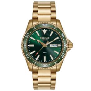 Relógio seculus diver automático 44237gpsvda7 dourado Relógio automático em aço, elegância e funcionalidade em um só acessório. Equipado com função dia/data, oferece praticidade para o dia a dia. Sua catraca giratória e fundo em vidro permitem uma visualização do movimento interno, destacando a engenharia de precisão. A coroa rosqueada proporciona proteção extra contra impactos e umidade, aumentando a durabilidade do relógio. O mostrador preto adiciona um toque contemporâneo ao design, complementado por uma caixa mediana de 42mm de diâmetro. A pulseira sólida com fecho de trava de segurança garante conforto e um ajuste perfeito para todos os tamanhos de pulso. Este relógio é uma escolha indispensável para quem valoriza estilo e performance em um único acessório. Especificações técnicas Mecanismo: automático - máquina miyota calibre 8205 reserva de marcha 42h Gênero: masculino Visor: verde sunray Vidro: cristal mineral Funções: calendário duplo day-date Prova d'água: 100m Características: com caixa e pulseira em aço inoxidável, coroa rosqueada, bisel giratório unidirecional, cade back transparente. Diâmetro da caixa: 42 mm : 2 anos pelo fabricante seculus Marca: Não Informado Ean: 7909669208501