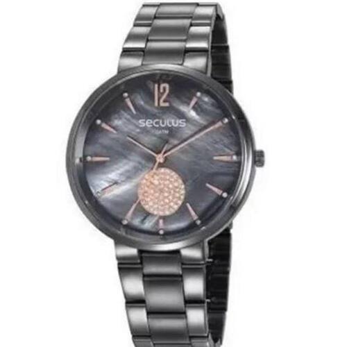 Relógio seculus feminino cristais AnalógicoPulseira em aço na cor grafite, possui fecho dobrável com travaA caixa em metal na cor grafite mede 3,5 cm de diâmetroMostrador em madrepérola com ponteiros filetes e marcadores na cor roséResistência à água de 5 atm Garantia de 2 anos com o fornecedor.O relógio seculus feminino cristais 77022lpsvss3 é fabricado por seculus da amazônia indústria e comércio.