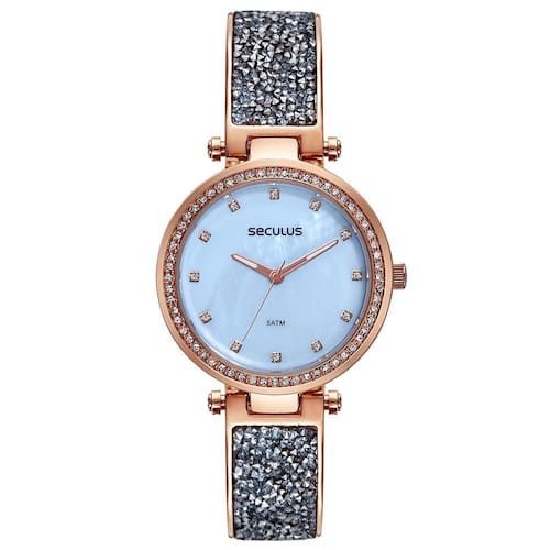 O Relógio Seculus 77276LPSVRB2 une luxo e sofisticação em um design exclusivo. Com caixa em aço rosé de 38 mm cravejada em cristais, ele traz imponência na medida certa. Seu mostrador em madrepérola azul acrescenta delicadeza e originalidade, enquanto os marcadores em cristais reforçam o brilho refinado do modelo.