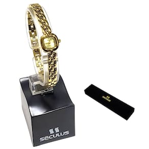 Marca: Seculus Modelo: 44068LPSVDA1 Tipo de relógio: Analógico Gênero: Feminino Cor da caixa: Dourado Cor da pulseira: Dourado Estilo: Casual Alarme: Não Cronômetro: Não Calendário: Não Luz: Não Resistência à água: Sim – 3 ATM = 30 metros Tipo de fecho: Fecho joia Material da caixa: Aço Material da pulseira: Aço Características do vidro: Cristal Mineral Tamanho da caixa (A x L): 13 x 12 mm Espessura da caixa: 6 mm Comprimento da pulseira: 19 cm Largura da pulseira: 6 mm Tampa do fundo: Pressão Peso: 24 Gramas Alimentação: Bateria Garantia do Fabricante: 12 meses Fabricante: Seculus da Amazônia Indústria e Com. S/A
