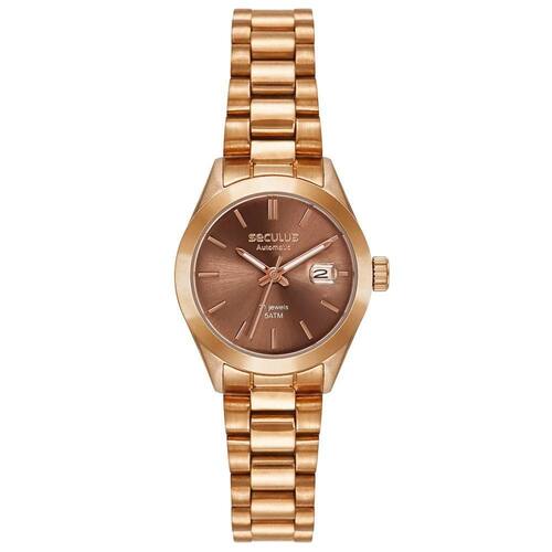Elegante relógio feminino em aço rose de 28mm, com fundo em vidro, calendário com lupa e movimento automático/manual Miyota 6T15. Ideal para quem busca estilo, precisão e sofisticação no dia a dia.