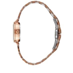 O mostrador desse relógio é analógico, proporcionando uma leitura clara e precisa das horas. O fecho tipo borboleta garante um ajuste seguro e confortável ao pulso. A combinação de cores branco e dourado confere um toque de elegância e sofisticação ao relógio.