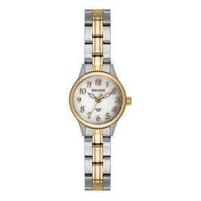 Vidro: cristal mineral Funções: analógico Resistencia à água: 50 m Características: com caixa de aço e pulseira de aço Diâmetro da caixa: 2,2 cm Fundo rosqueado Alimentação do maquinário: bateria Mostrador madreperola branco com todos os números Linha: seculus long life Prateado com dourado