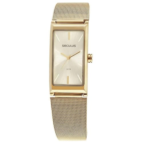 Relógio seculus feminino ref: 77144lpsvds1 retangular mesh dourado Descrição do produto: Vidro: cristal mineral Funções: analógico Resistencia à água: 30 m Características: com caixa de metal especial e pulseira de aço mesh Diâmetro da caixa: 2,2 cm x 3,8 cm Fundo Alimentação do maquinário: bateria Mostrador champanhe de 2 anos Marca: Não Informado Ean: 7909669098850