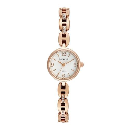 Relógio Seculus Feminino Ref: 77225Lpsvrb2 Bracelete Mini Rosé O Relógio Seculus Feminino Ref: 77225Lpsvrb2 Bracelete Mini Rosé é perfeito para mulheres que buscam estilo e elegância em seu dia a dia. Com um design sofisticado, esse relógio se destaca por sua pulseira e caixa de metal na cor rosé, que conferem um toque de delicadeza ao acessório. Esse relógio possui vidro de cristal mineral, o que garante maior resistência a impactos e arranhões. Além disso, sua resistência à água de até 50 metros permite que você o use tranquilamente em atividades cotidianas, como lavar as mãos ou tomar banho. Com um mostrador prateado com números, o Relógio Seculus Feminino Ref: 77225Lpsvrb2 oferece uma leitura fácil e rápida das horas. Seu diâmetro de caixa de 2,3 cm e altura de 0,8 cm proporcionam um tamanho compacto e discreto, perfeito para quem prefere acessórios mais delicados. Esse relógio funciona com bateria e possui um fundo rosqueado, o que confere maior segurança e durabilidade ao maquinário. Além disso, seu bracelete é destacável, oferecendo a opção de uso somente com a pulseira de metal ou com a adição de uma pulseira rosé semijóia, que adiciona um toque de glamour ao acessório. O Relógio Seculus Feminino Ref: 77225Lpsvrb2 Bracelete Mini Rosé conta com uma de 2 anos, o que demonstra a confiança da marca na qualidade e durabilidade do produto. - Esse relógio é resistente à água? Sim, o Relógio Seculus Feminino Ref: 77225Lpsvrb2 Bracelete Mini Rosé possui resistência à água de até 50 metros, o que permite seu uso tranquilo em atividades cotidianas como lavar as mãos ou tomar banho. - A pulseira é ajustável? Sim, a pulseira desse relógio é ajustável, permitindo que você a adapte ao tamanho do seu pulso de forma confortável. - O relógio vem com ? Sim, o Relógio Seculus Feminino Ref: 77225Lpsvrb2 Bracelete Mini Rosé possui de 2 anos, o que demonstra a confiança da marca na qualidade e durabilidade do produto. - É possível trocar a pulseira? Sim, esse relógio possui uma pulseira de metal que pode ser trocada. Além disso, acompanha uma pulseira rosé semijóia, que adiciona um toque de glamour ao acessório.