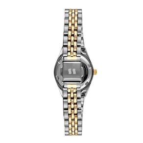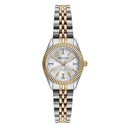Vidro: cristal mineral Funções: analógico Resistencia à água: 50 m Características: com caixa de aço e pulseira de aço Diâmetro da caixa: 2,4 cm Fundo rosqueado Alimentação do maquinário: bateria Mostrador prateado com pedras Prateado com dourado Linha: seculus long life