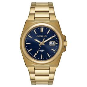 Relógio seculus long life 44263gpsvda3 aço social calendário O relógio masculino analógico em aço dourado combina sofisticação e funcionalidade em um design clássico. Com caixa de 4 cm de diâmetro, oferece um ajuste confortável ao pulso, ideal para quem busca um acessório elegante e marcante. O mostrador claro, os ponteiros geométricos e a lupa no vidro acima do calendário garantem um visual refinado e de fácil leitura. A pulseira conta com um fecho de trava de segurança, proporcionando praticidade e ajuste perfeito. Perfeito para compor looks sociais, esse modelo une estilo e precisão em cada detalhe. Especificações técnicas Mecanismo: analógico Gênero: masculino Visor: azul Vidro: cristal mineral Funções: calendário Prova d'água: 50m Características: com caixa e pulseira em aço inoxidável Diâmetro da caixa: 40 mm Largura da pulseira: 22 mm : 2 anos pelo fabricante seculus