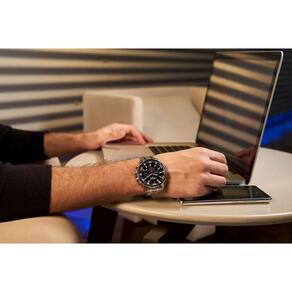 Seu mostrador preto com textura diferenciada traz excelente leitura, contando com cronógrafo funcional, indicadores bem definidos e calendário com data, ideal para quem valoriza desempenho e organização. A caixa de 40 mm proporciona presença equilibrada no pulso, adequada tanto para o dia a dia quanto para ocasiões mais esportivas.